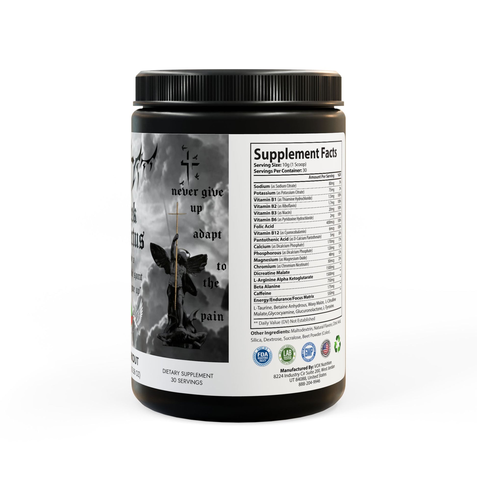 Ingredients: Sodium (as Sodium Citrate), Potassium (as Potassium Citrate), Vitamin B1 (as Thiamine Hydrochloride), Vitamin B2 (as Riboavin), Vitamin B3 (as Niacin), Vitamin B6 (as Pyridoxine Hydrochloride), Folic Acid, Vitamin B12 (as Cyanocobalamin), Pantothenic Acid (as D-Calcium Pantothenate), Calcium (as Dicalcium Phosphate), Phosphorous (as Dicalcium Phosphate), Magnesium (as Magnesium Oxide), Chromium (as Chromium Nicotinate), Dicreatine Malate, L-Arginine Alpha Ketoglutarate, Beta Alanine, Caffeine, L-Taurine, Betaine Anhydrous, Waxy Maize, L-Citrulline, Malate ,Glycocyamine, Glucuronolactone, L-Tyrosine. Other Ingredients: Maltodextrin, Natural Flavors, Citric Acid, Silica, Dextrose, Sucralose, Beet Powder (Color).